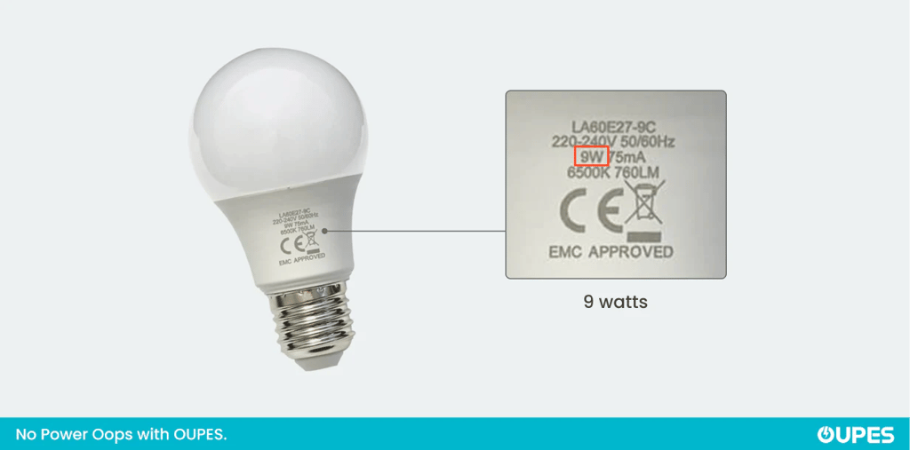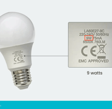 Los vatios indican la cantidad de electricidad que consumen tus electrodomésticos y normalmente puedes encontrar esta información en el propio producto. Por ejemplo, una bombilla puede tener una etiqueta que indique que utiliza 9 vatios. Esto significa que cuando enchufas la bombilla a una lámpara y la enciendes, consumirá 9 vatios de electricidad.